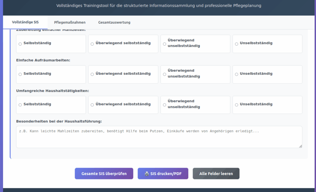 Alle 8 SIS-Module vollständig abgedeckt: Von Mobilität über kognitive Fähigkeiten bis zur Haushaltsführung – jeder Aspekt der Pflegebegutachtung kann realitätsnah geübt werden. Das integrierte Bewertungssystem gibt prozentuale Qualitätsbewertungen und spezifische Verbesserungsvorschläge.