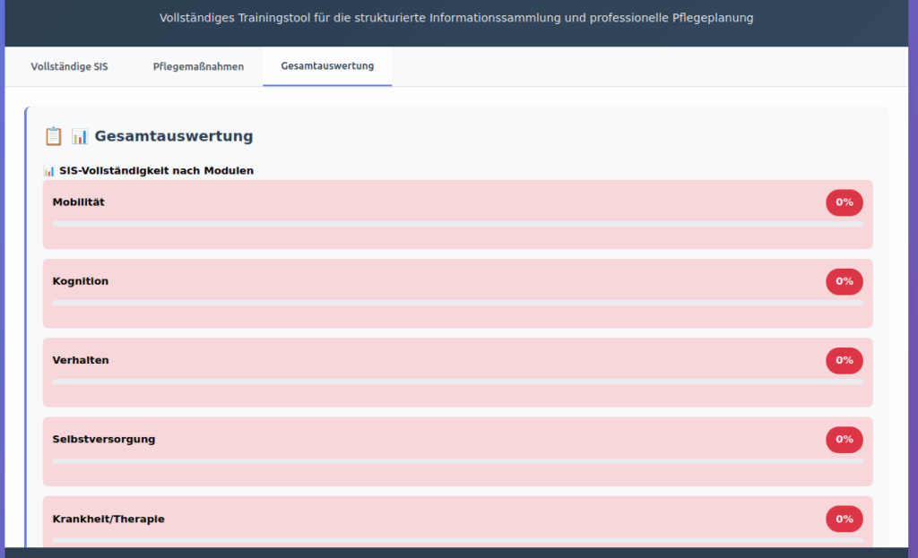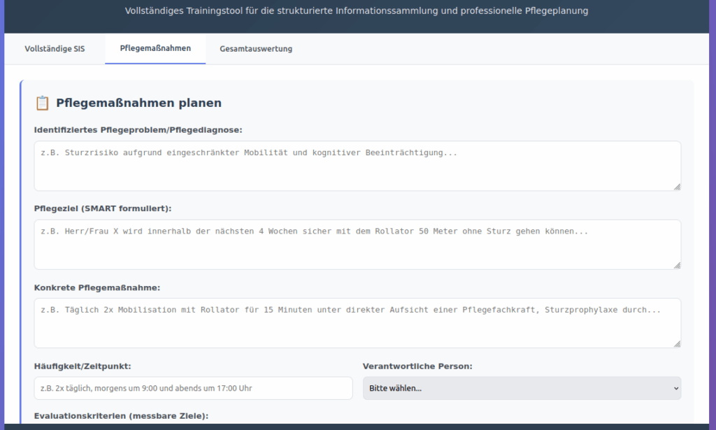 Der SIS & Pflegeplanung Trainer ist eine umfassende Schulungsanwendung, die Pflegekräften ermöglicht, die strukturierte Informationssammlung (SIS) und professionelle Pflegemaßnahmenplanung praxisnah zu erlernen und zu vertiefen. Die Anwendung basiert auf den aktuellen Begutachtungsrichtlinien des GKV-Spitzenverbandes und bietet sofortiges, intelligentes Feedback zur Dokumentationsqualität.