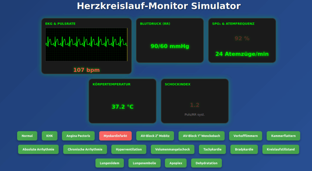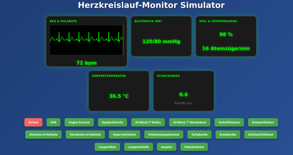 19 Krankheitsszenarien verfügbar: Von normalen Vitalwerten über Herzerkrankungen (KHK, Herzinfarkt, Herzrhythmusstörungen) bis hin zu Notfallsituationen (Kreislaufstillstand, Lungenembolie, Schock). Jedes Szenario zeigt charakteristische EKG-Veränderungen und entsprechende Vitalparameter-Abweichungen.