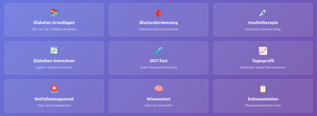 Neun Fachmodule vollständig integriert: Diabetes-Grundlagen mit Typ-1/Typ-2-Unterscheidung, Blutzuckermessung-Simulator mit realistischem Messablauf, Insulintherapie mit Dosisrechner, praktischer Einheiten-Umrechner (mg/dl ↔ mmol/l), OGT-Test-Simulation mit WHO-Bewertung, Blutzucker-Tagesprofil mit grafischer Auswertung, Notfallmanagement für Hypo-/Hyperglykämie, interaktiver Wissenstest und professionelle Dokumentationsvorlagen.