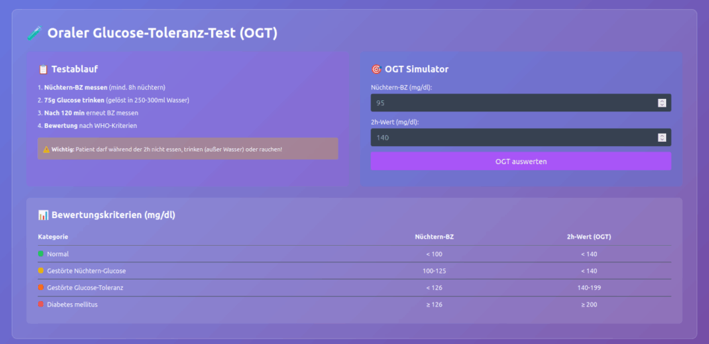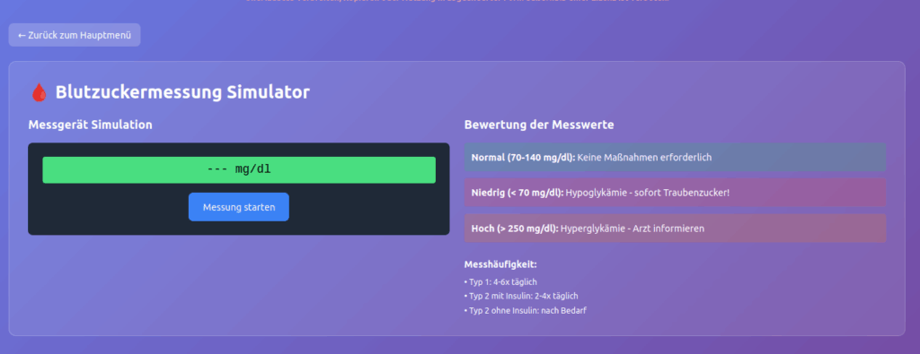 Realitätsnahe Simulationen: Der Blutzuckermessungs-Simulator führt schrittweise durch den korrekten Messablauf, der Insulinrechner berechnet Dosierungen basierend auf Blutzucker und Kohlenhydraten, und der OGT-Test wertet Glucose-Toleranz-Tests nach medizinischen Standards aus.