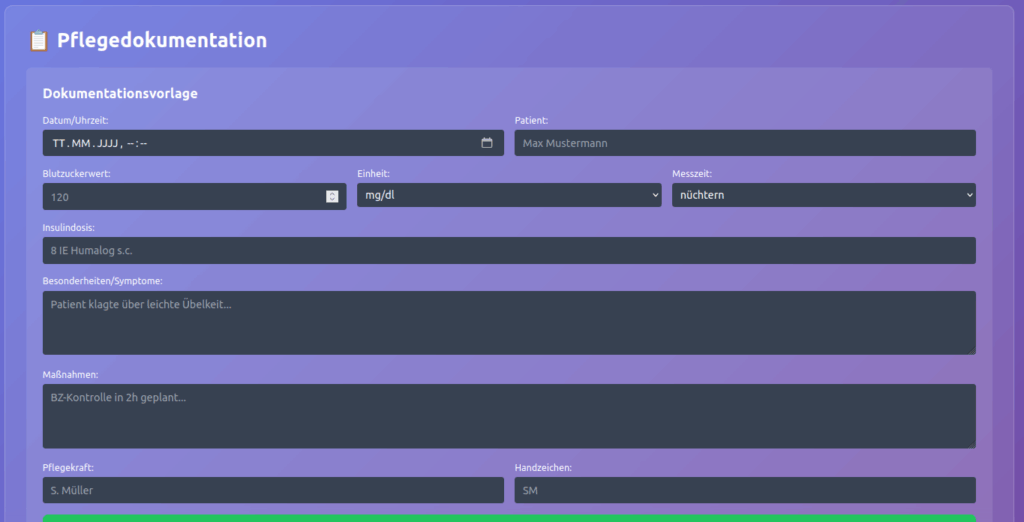 Besonders wertvoll für Pflegeschulen: Auszubildende können das Erstellen von Pflegeplanungen praxisnah üben – von der korrekten Problemidentifikation über SMART-Ziele bis hin zu konkreten Maßnahmen und Evaluationskriterien. Das System erkennt häufige Dokumentationsfehler und gibt gezielte Hilfestellungen.