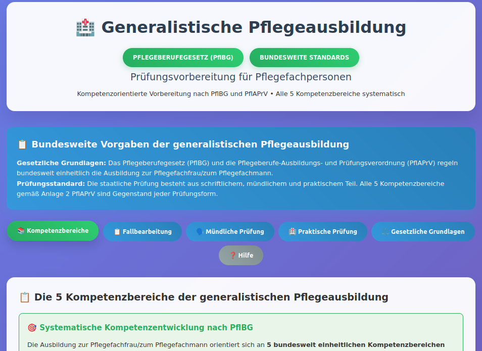 Diese umfassende Lernanwendung bereitet systematisch auf alle drei Prüfungsteile der generalistischen Pflegeausbildung vor. Die Anwendung orientiert sich an den bundesweiten Standards des Pflegeberufegesetzes (PflBG) und der Pflegeberufe-Ausbildungs- und Prüfungsverordnung (PflAPrV) mit allen 5 Kompetenzbereichen nach Anlage 2.