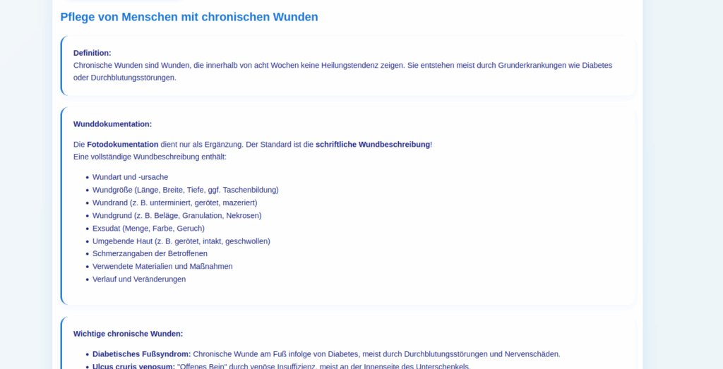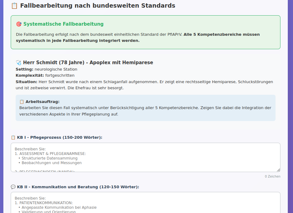 Interaktive Fallbearbeitung: Strukturierte Bearbeitung komplexer Pflegesituationen von Grundlagen bis Expertenlevel. Verschiedene Settings (Akutpflege, Langzeitpflege, ambulante Versorgung, Pädiatrie) mit systematischer Integration aller Kompetenzbereiche und sofortigem Feedback.