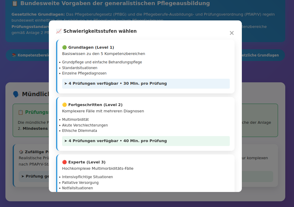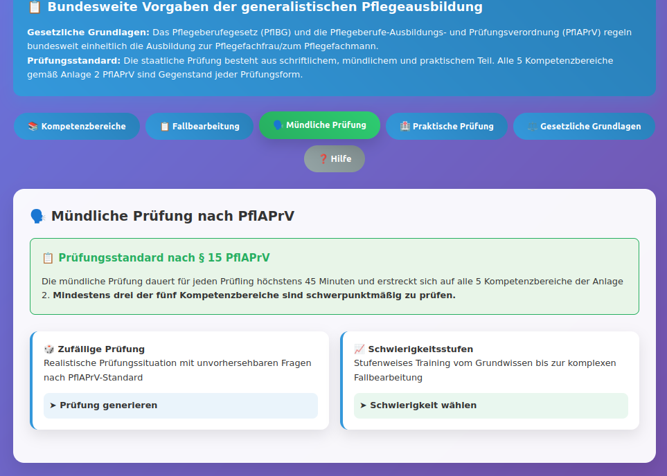 Mündliche Prüfungssimulation: Strukturierte Fragensets nach Schwierigkeitsgraden mit Fokus-Kompetenzbereichen entsprechend § 15 PflAPrV. Zufallsgenerator für unvorhersehbare Prüfungssituationen und systematische Vorbereitung auf alle Themenbereiche.