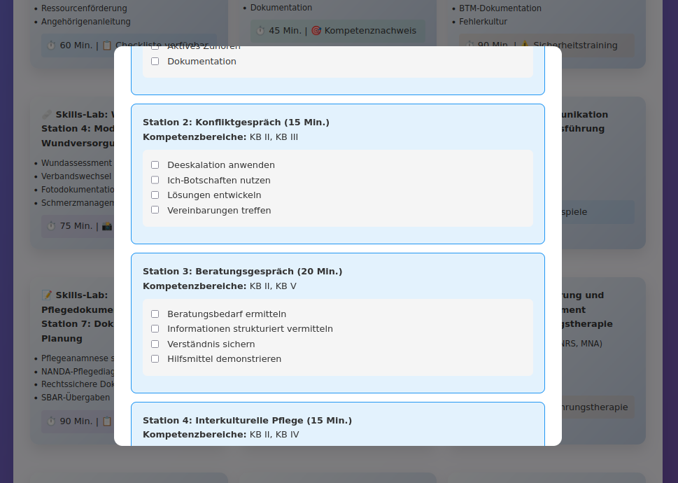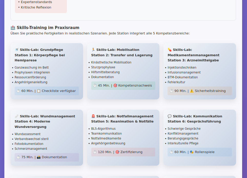 Skills-Training mit 12 Stationen: Praktische Fertigkeiten von Grundpflege bis Notfallmanagement mit detaillierten Checklisten. Jede Station integriert mehrere Kompetenzbereiche und bietet Timer-Funktionen für realistische Prüfungsbedingungen.