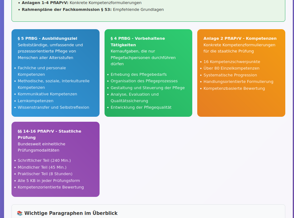 Rechtliche Grundlagen komplett: Vollständige Abdeckung von PflBG, PflAPrV und relevanten Anlagen mit praktischen Bezügen. Vorbehaltene Tätigkeiten nach § 4 PflBG, Kompetenzformulierungen nach Anlage 2 und Stundenverteilung nach Anlage 6.