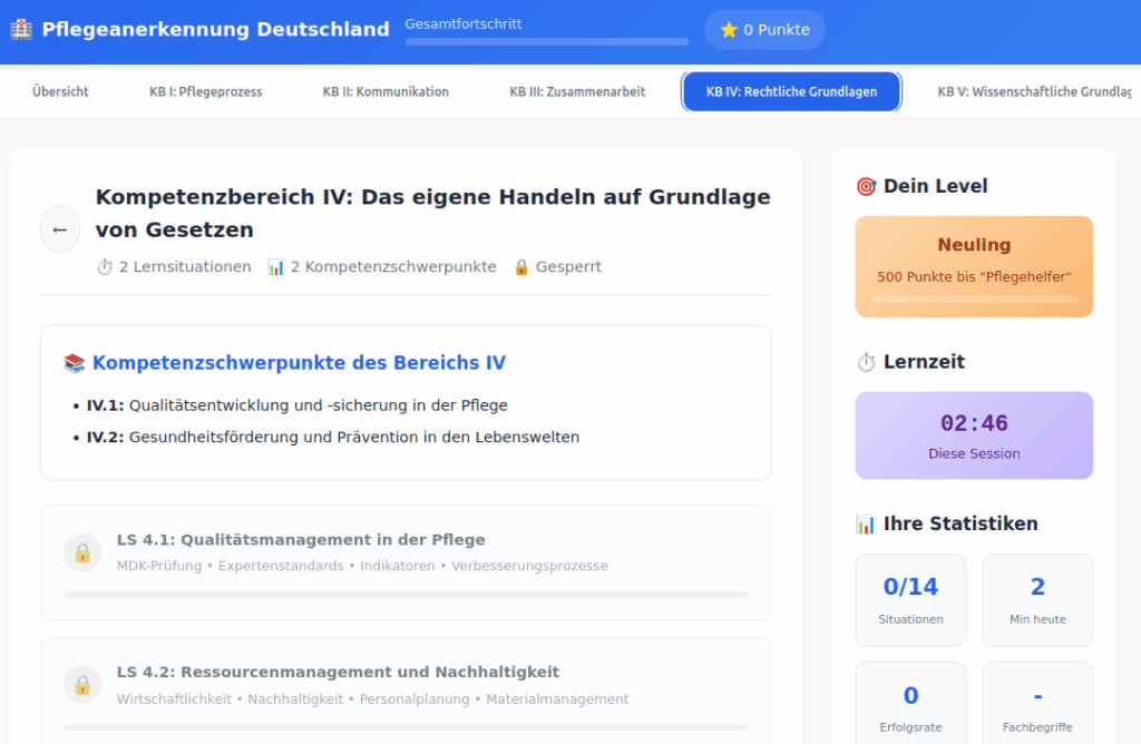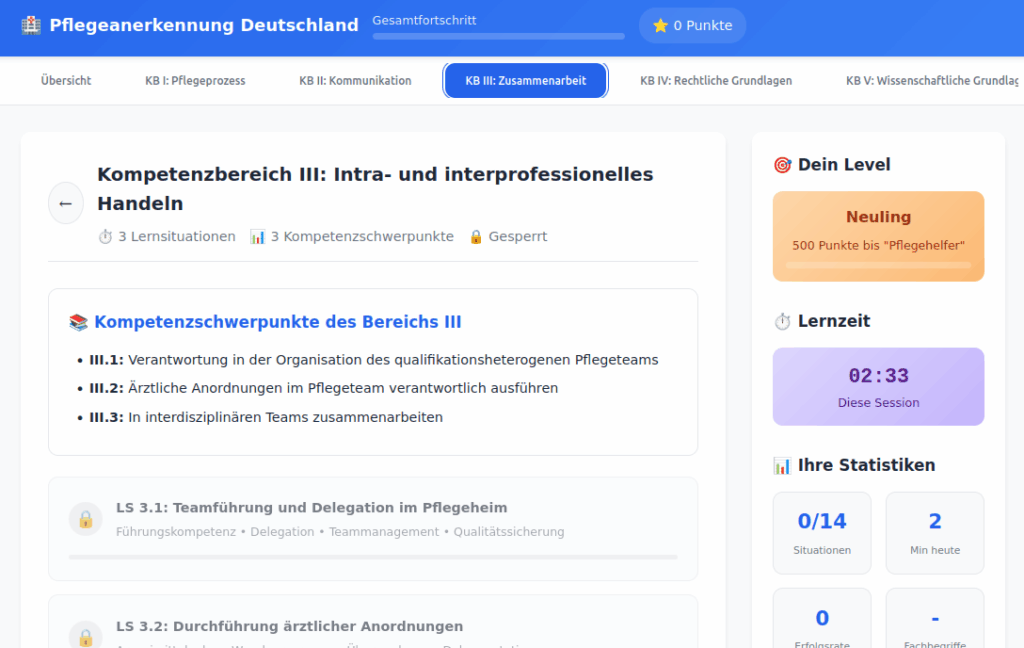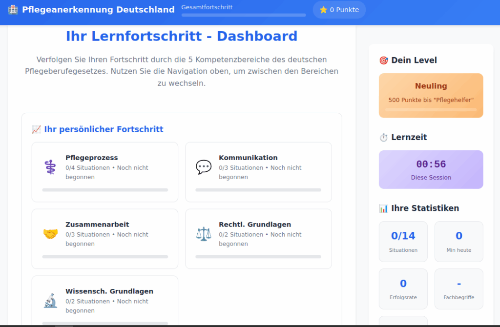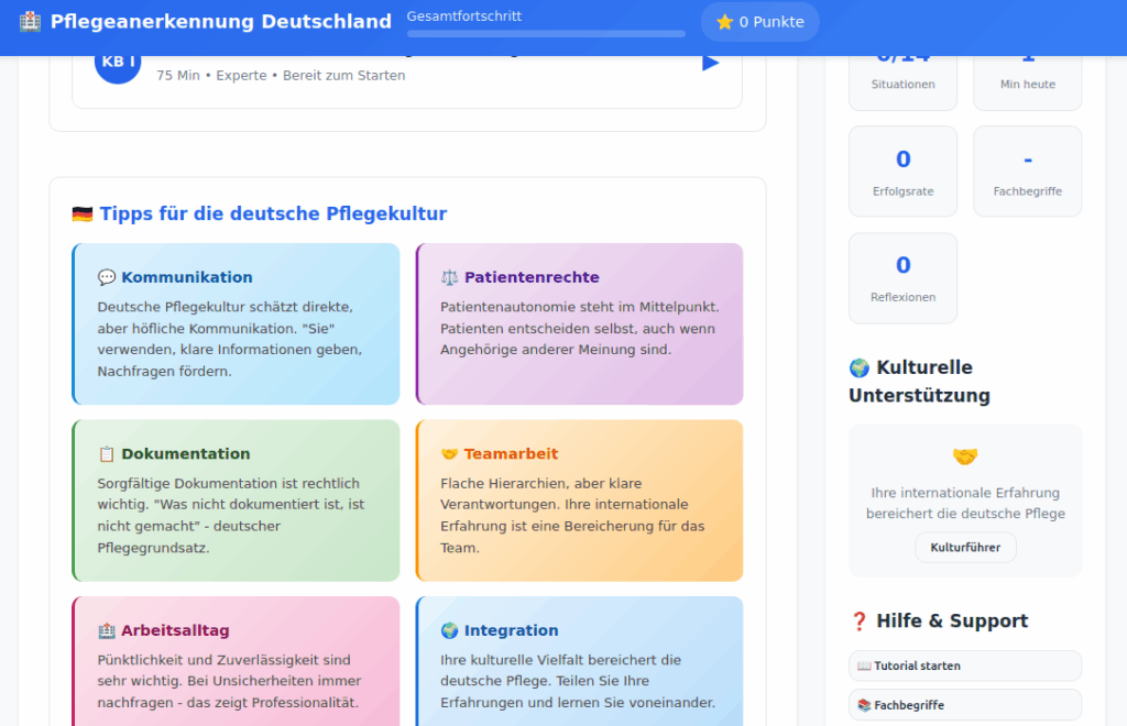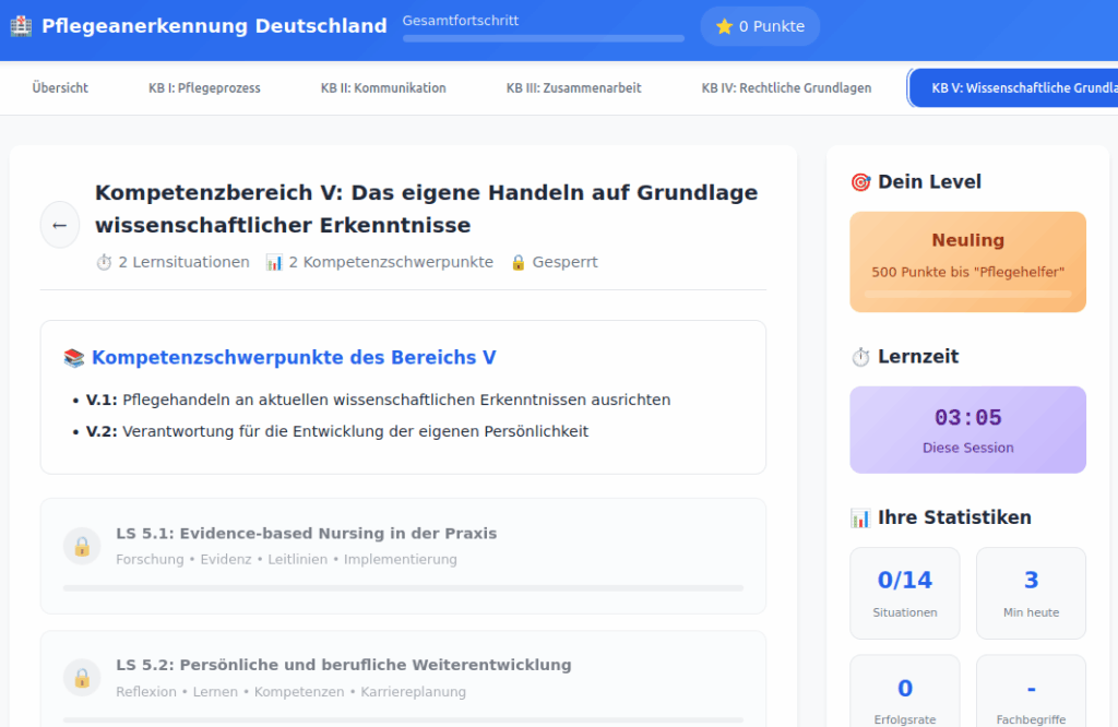 Diese innovative Lernplattform unterstützt internationale Pflegefachkräfte bei der erfolgreichen Anerkennung ihrer Abschlüsse in Deutschland durch strukturierte, interaktive Lernsituationen und praxisnahe Übungen. Die Anwendung kombiniert alle fünf Kompetenzbereiche des deutschen Pflegeberufegesetzes in einer benutzerfreundlichen, gamifizierten Oberfläche.