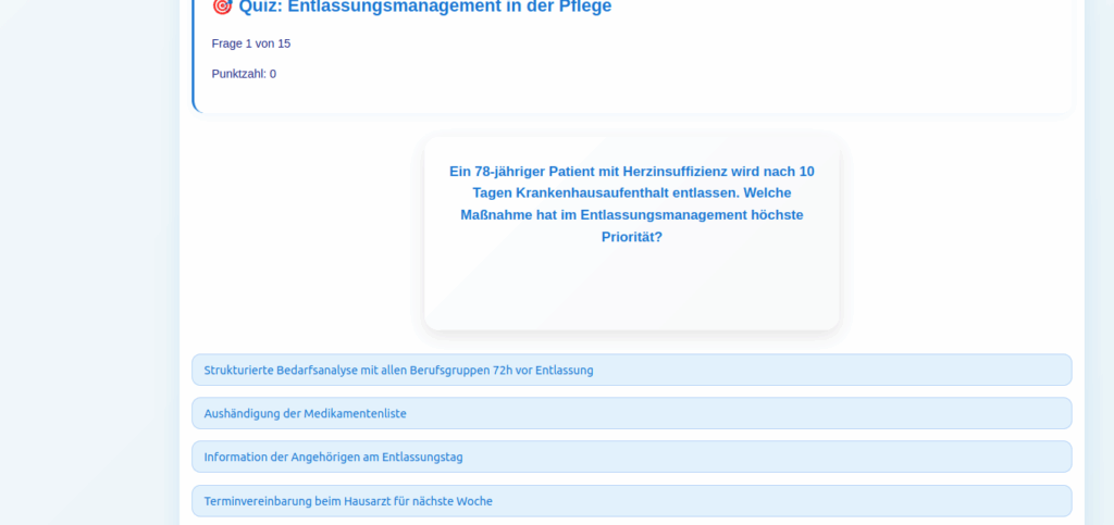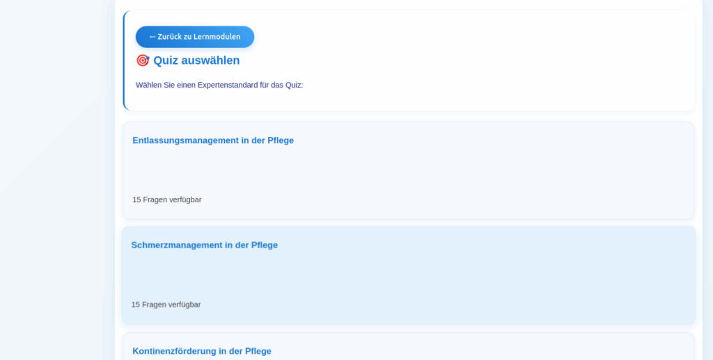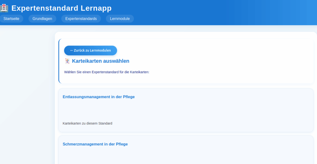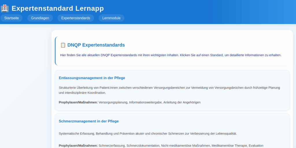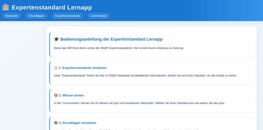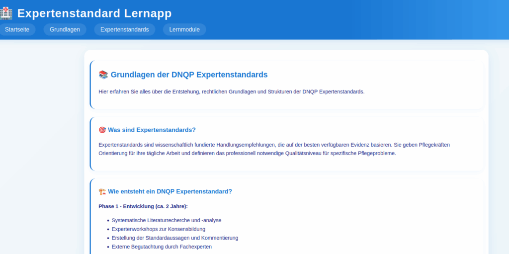 Diese innovative Progressive Web App (PWA) bietet eine vollständige, interaktive Lernumgebung für alle 12 aktuellen DNQP Expertenstandards. Speziell entwickelt für Pflegeauszubildende, Lehrkräfte und Pflegefachkräfte, die ihr Wissen vertiefen und auf dem neuesten Stand halten möchten.