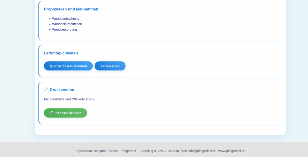 Didaktisch strukturierte Inhalte: Jeder Standard umfasst Definition, Grundaussage, Ziele, Problemdefinition, Strukturebenen, rechtliche Aspekte, Assessment-Instrumente, spezifische Fachkenntnisse (wie Dekubitus-Grade, Schmerzarten, Kontinenzprofile) und praktische Prophylaxemaßnahmen.